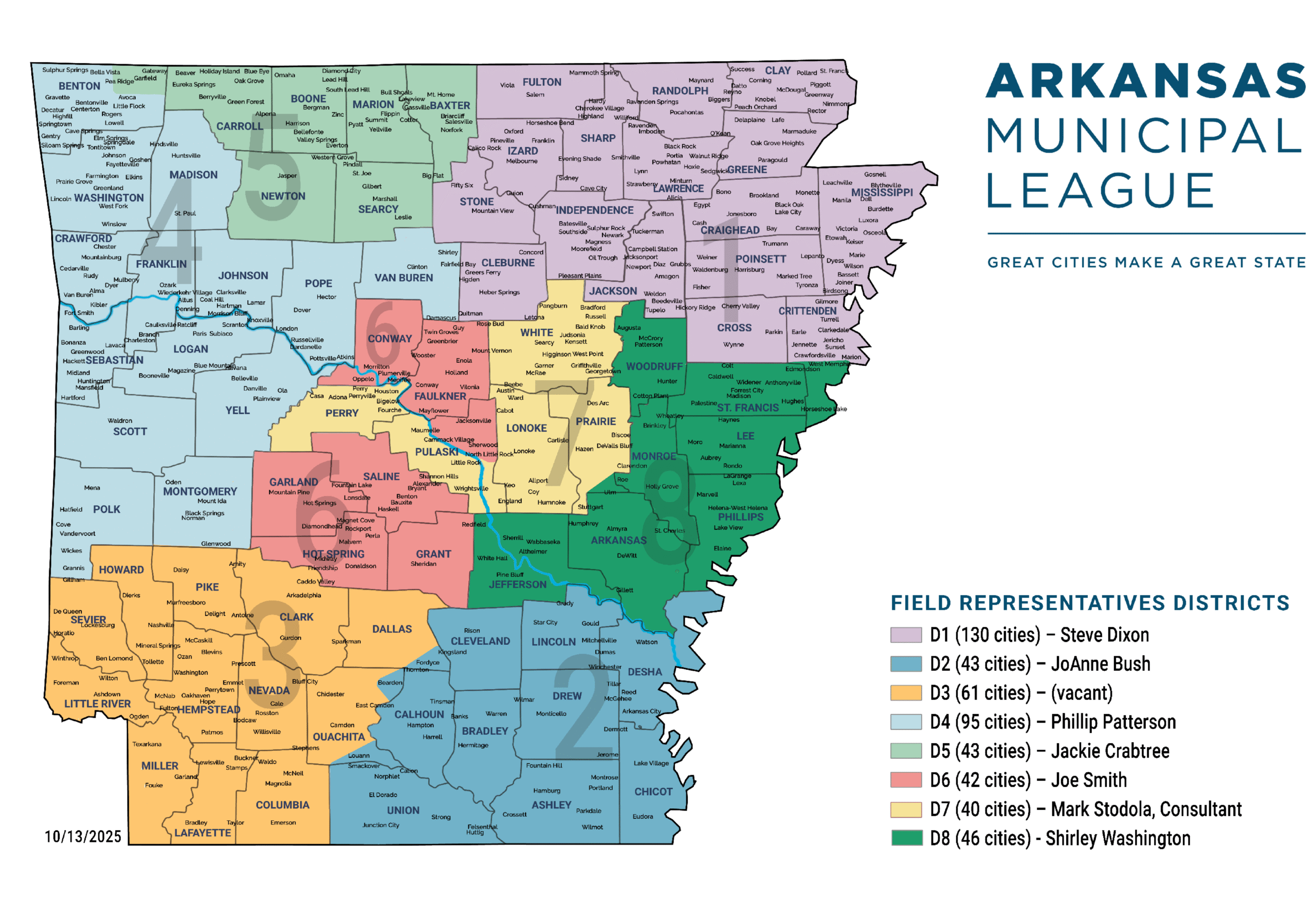 The League’s field representative outreach initiative was developed in 2022 to fill a gap in addressing the needs of Arkansas’ municipal officials. Seven retired elected officials are currently employed as full- and part-time field reps in eight districts around the state. With decades of public service and experience, the League’s field rep team is uniquely qualified to offer guidance on a broad range of issues and serve as a liaison between member municipalities and League staff.